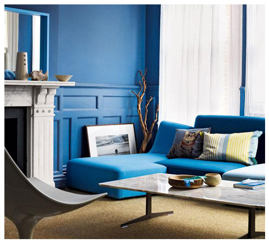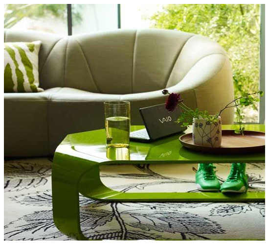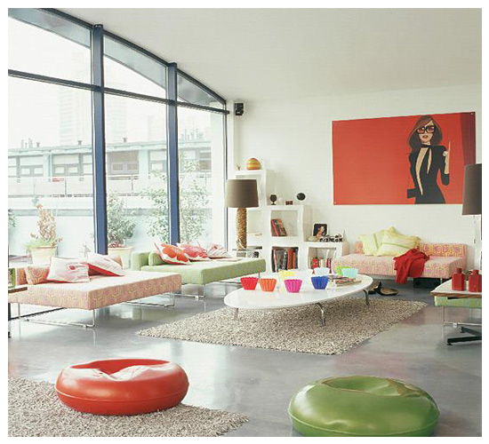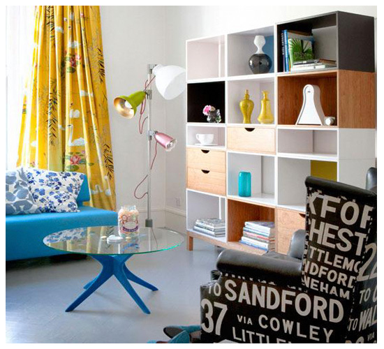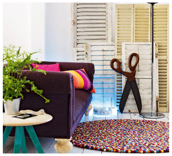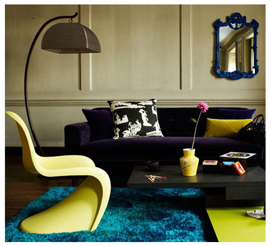 โซฟาสีม่วง เก้าอี้สีเหลืองมะนาว กับ พรมสีฟ้าคราม ก็ยังเข้ากันได้เริดทีเดียว