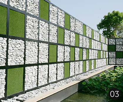 เลือกตกแต่งริมรั้วปูนด้วยการทำโครงเหล็กเป็นช่อง ๆ ไว้ใส่วัสดุตกแต่งลงในช่องนั้น ๆ อาจติดตั้งแบบถาวรหรือปรับเปลี่ยนแก้เบื่อได้ อย่างไอเดียนี้ใช้การจัดเรียงหินปูนซ้อนกันและโบกปูนจนเต็มช่อง สลับกับการกรุหญ้าเทียมหรือจะปลูกสวนแนวตั้งลงไปแทนก็ดูสวยเป็นธรรมชาติดี