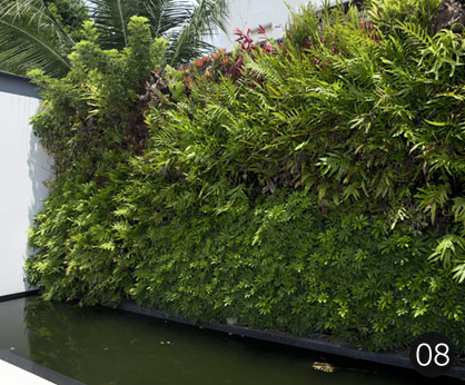 ทำสวนแนวตั้งบนรั้วบ้านเสียเลยด้วยการก่อกำแพงให้มีกระบะปูนยื่นออกจากผนัง 30 เซนติเมตร ลึก 30 เซนติเมตรตลอดแนวกำแพง แล้วปลูกไม้ใบที่มีกิ่งก้านแผ่สวย ๆ และไม่ต้องการดินมากอย่างเฟินชนิดต่าง ๆ มาปลูกจนคลุมทั่วทั้งสวนแนวตั้ง