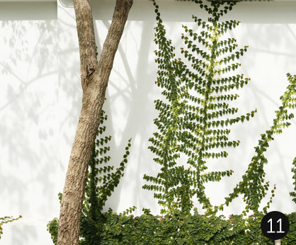 หากกำแพงปูนดูเรียบและแข็งกระด้าง เรามีไอเดียเพิ่มความสดชื่นง่าย ๆ มาฝาก ด้วยการใช้สีเขียวจากต้นตีนตุ๊กแกให้เลื้อยปกคลุมทั่วทั้งกำแพง เริ่มจากก่อกระบะดินสำหรับปลูกต้นตีนตุ๊กแกให้ยาวตลอดแนวกำแพง เพื่อให้ต้นตีนตุ๊กแกเลื้อยขึ้นที่สูง หรือจะปลูกพรรณไม้ชนิดอื่นอย่างพลูด่างหรือเดฟให้ห้อยลงมาคลุมกำแพงแทนก็ได้ เพียงย้ายกระบะดินให้อยู่บนแนวกำแพงด้านบนแทน