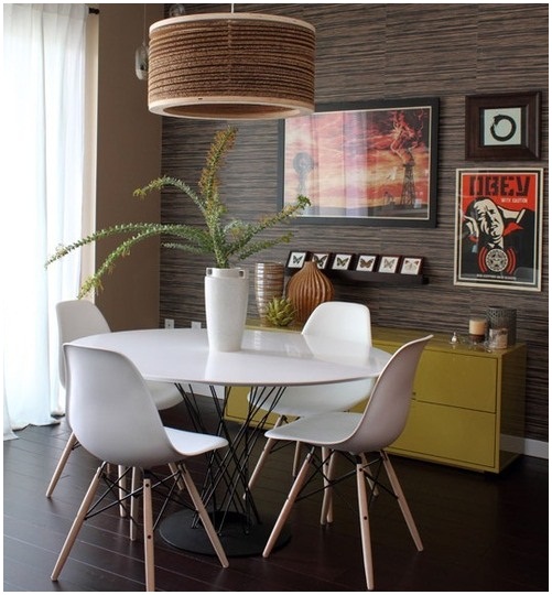 ลองเปลี่ยนผนังให้กลายเป็นลายไม้ดู  เพียงผนังที่เปลี่ยนก็สามารถเปลี่ยนอารมณ์ของห้องได้ในทันที  จากนั้นก็หาโคมไฟลายธรรมชาติมาแขวน พร้อมกับโต๊ะทานข้าวที่เน้นความโมเดิร์น  ส่วนผนังก็จัดแต่งด้วยรูปภาพโปรดที่อยากนั่งมองเวลาทานข้าว