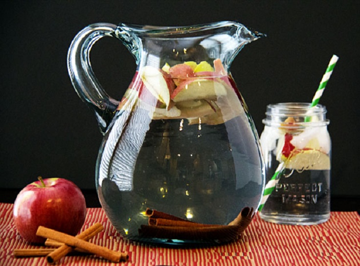7. น้ำแอปเปิ้ลใส่อบเชย หั่นแอปเปิ้นเป็นชิ้นเล็กๆเติมน้ำในเหยือก หย่อนอบเชยลงไปเพิ่มคุณค่าและกลิ่น เท่านี้คุณจะสดชื่นทั้งวัน
