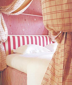 3. หวานๆ โรแมนติก สไตล์ Old English Style เป็นบรรยากาศที่ดูน่าสบายเหมือนอยู่ในทุ่งดอกกุหลาบ เตียงนอนสี่เสาติดม่านระบายรอบเตียงและมีทิ้งชายยาวข้างหัวเตียง หัวเตียงเล่น curve ได้อย่างลงตัว ความเด่นของห้องหนีไม่พ้นลวดลายและความเนี๊ยบของเสาทั้งสี่ต้น นอกจากนี้ยังมี Bench ลายดอกกุหลาบ ผ้าม่านเป็นผ้าพิมพ์ลายเดียวกันกับม่านระบายรอบเตียง เพิ่มความหวานเข้าไปอีกด้วยการใช้พรมสีโทนออกชมพูม่วง เพื่อเพิ่มความสว่างให้กับห้อง เหมือนเดินอยู่ท่ามกลางสวนกุหลาบทีเดียว