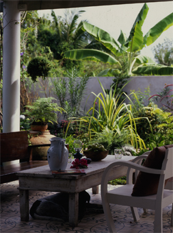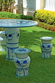 2. นอกจากเฟอร์นิเจอร์ไม้แล้ว มุมนั่งเล่นนอกบ้านก็สามารถเลือกใช้โต๊ะ-เก้าอี้ที่ทำจากเซรามิกมาช่วยเปลี่ยนบรรยากาศได้ เพราะความหนักแน่นมั่นคงไม่ต้องกลัวปลิว แถมยังทนแดดทนฝนได้อย่างสบาย ตั้งเป็นมุมนั่งเล่นถาวรก็ได้ แต่ควรเลือกรูปทรงที่โปร่งหน่อยเพื่อไม่ให้ดูหนักหรืออึดอัดเวลามอง