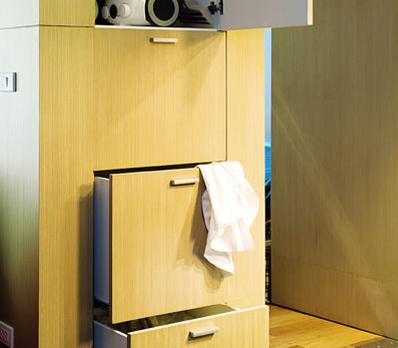 ตะกร้าผ้าไม่จำเป็นต้องไปนอนนิ่งอยู่ในห้องน้ำ เลือกทำตู้บิลท์อินสำหรับเก็บผ้าเตรียมซักไว้หน้าห้องน้ำจะคุ้มกว่าต้องก้มเก็บและเลื่อนตะกร้าไปมาทุกวัน ตู้ที่ว่านี้ออกแบบให้มีลิ้นชักกว้างเป็นพิเศษ สูงประมาณ 40 เซนติเมตร และลึก 50 – 60 เซนติเมตร อาจแยกเป็นชั้นตามจำนวนสมาชิกในบ้าน หรือแยกเป็นชั้นผ้าสีกับผ้าขาวก็ได้ ถ้าด้านบนยังเหลือพื้นที่ ก็ทำเป็นตู้สูงเก็บอุปกรณ์ทำความสะอาดเพิ่มได้อีกนะ ไอเดียนี้ทั้งดูสวยสบายตาและใช้พื้นที่ได้อย่างคุ้มค่าจริงๆ