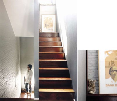 ซ้าย โถงบันไดที่ดูน่าสนใจด้วยผนังก่ออิฐโชว์แนวสีขาว ภาพโปสเตอร์เวียดนามเป็นของเพื่อนสนิทชาวญี่ปุ่นที่ไปเปิดแกลเลอรี่ที่ฮานอย เป็นภาพโดยศิลปินแห่งชาติเวียดนามในสมัยคอมมิวนิสต์ที่รัฐบาลสั่งให้ออกแบบขึ้น เป็นภาพพิมพ์ตัวจริงของโปสเตอร์โฆษณาชวนเชื่อในสมัยปี 80