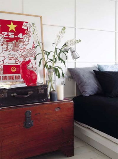 หีบไม้ที่เธอซื้อเก็บไว้นานแล้วนำมาใช้เป็นโต๊ะข้างเตียง ประดับด้วยโปสเตอร์โฆษณาชวนเชื่อจากแกลเลอรี่ของเพื่อนที่ฮานอย โคมไฟ กระต่ายสีแดงจะเรืองแสงเมื่อเปิดไฟ ได้มาจากทริปสแกนดิเนเวีย