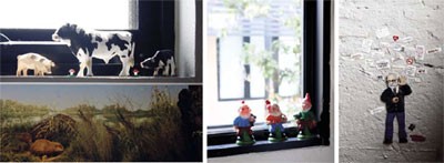 (จากซ้ายไปขวา) ตุ๊กตาไม้จากชุดปศุสัตว์ที่เธอได้มาจากเยอรมัน, ตุ๊กตาคนแคระมาจากยุโรป มันเป็นตุ๊กตา โนม เป็นเทพที่ชาวเยอรมันเขานิยมเอาไปตกแต่งในสวน จริงๆ พลอยมีชุดใหญ่แล้ว แต่พอมาเจอตัวเล็กก็เลยชอบ ซื้อมาอีก, งานศิลปะตัดแปะของพลอยบนผนังข้างบันไดที่เพิ่งจะเริ่มต้นขึ้น เท่านั้น พลอยชอบงานศิลปะแบบ ตัดแปะ แล้วก็ผนังบันไดทาสีขาวไว้พอดี เลยเอาสติ๊กเกอร์มาติดอันนี้เป็นซิกมันด์ ฟรอยด์ (Sigmund Freud) เห็นว่าสวยดีและเป็นงานที่เราชอบด้วย เลยเอามาแปะผนังบ้าน ซึ่งอาจจะขยายไปอีก แต่ยังไม่แน่ว่าจะทั้งผนังเลยหรือเปล่า ยังบอกไม่ได้ คงต้องรอดูว่าจะได้สติ๊กเกอร์ที่ชอบมาอีกมั้ย พลอยบอก