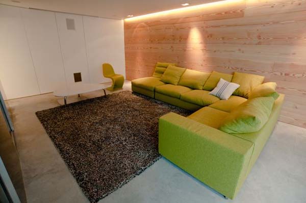 ห้องนั่งเล่นที่จะเป็นผนังไม้ด้านหลังบางส่วน และจะใช้โซฟาสีเขียวเพื่อให้ดูเป็นธรรมชาติซึ่งจะตัดกับสีพรมกันคนละขั่ว