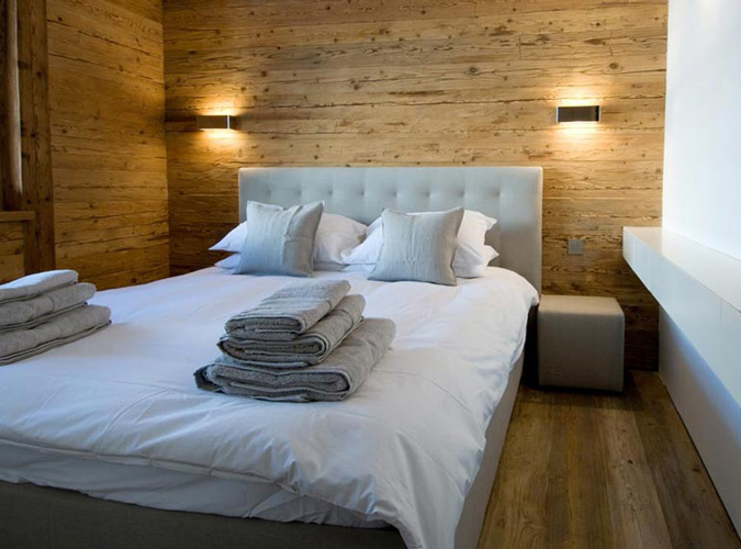 ห้องนี้เป็นห้องนอนคู่จะใช้ไม้ผนังไม้แผ่นใหญ่ และจะเสริมด้วยโคมไฟไม้ด้านบนเพดาน