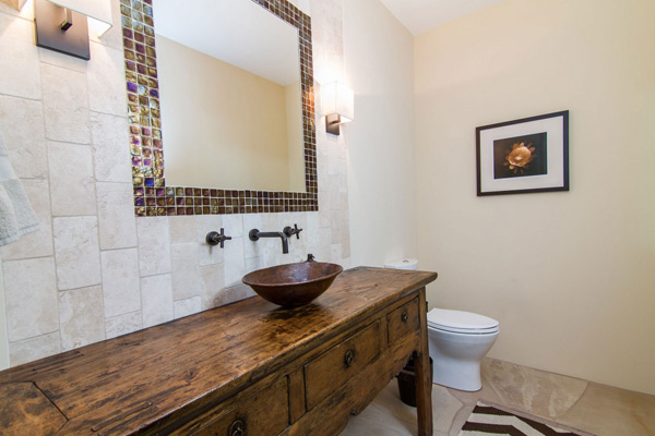 ห้องน้ำจะที่ใช้กระเบื้องสีเท่าเข็มในการปูพื้นแต่จะทาพื้นสีขาวเพื่อให้ดูตัดกัน
