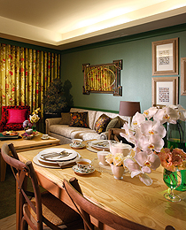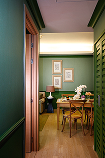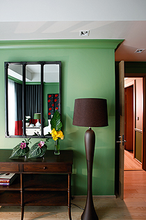 ที่สุดปลายของทางเดินมีโต๊ะสีแดงแบบเครื่องเขินจีนหยุดสายตา ก่อนจะส่งต่อให้กับพรมขนฟูและลายดอกกุหลาบที่ล่องลอยอยู่บนหัวเตียง การใช้สีคู่ตรงข้ามอาจดูต้องห้ามแต่กลับสร้างแรงดึงดูดอย่างประหลาด อย่างแดงและเขียวที่มีความสดเข้มจางที่ไม่เท่ากัน จะลดความร้อนแรงของการปะทะและช่วยสนับสนุนให้ต่างฝ่ายต่างโดดเด่นขึ้น