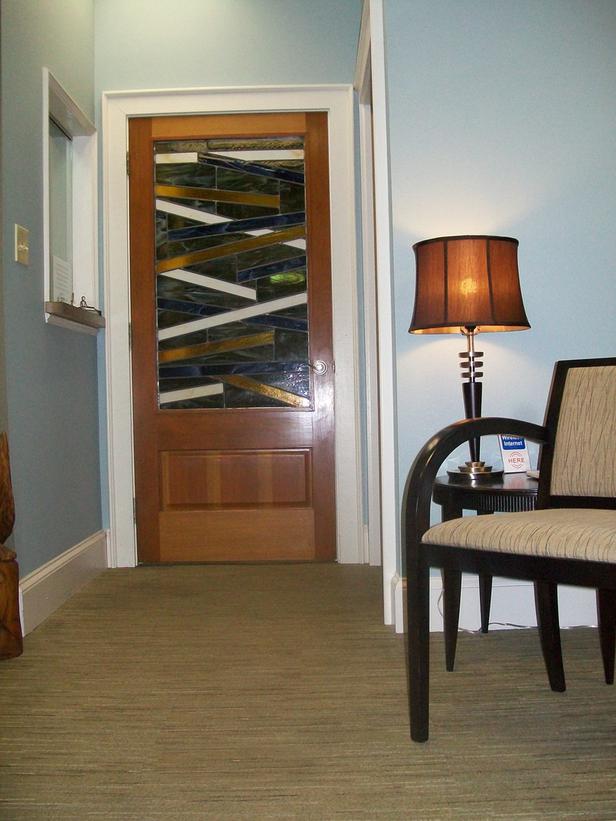 เป็นการตกแต่งประตูด้วยกระจกที่มีสีสันและลวดลายที่โดดเด่นทำให้ช่วยสร้างสีสันให้กับห้องได้ไม่น้อยเลยละค่ะ