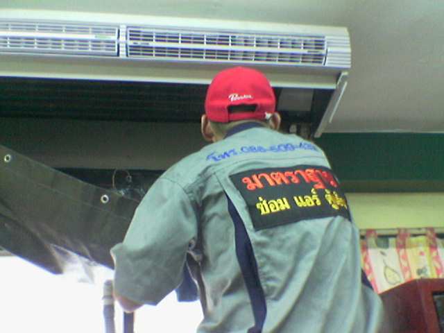 8. ในส่วนของคอยล์ร้อน (condersing Unit) หรือส่วนของเครื่องที่อยูภายนอกห้อง ช่างจะถอดโครงเครื่องออก และนำแผ่นพลาสติกมาหุ้มป้องกันมอเตอร์และอุปกรณ์ไฟฟ้าให้มิดชิดเพื่อกันน้ำเข้า จากนั้นก็ล้างทำความสะอาดใบพัดลม ครีบระบายความร้อนของแผงคอยล์ร้อนและโครงเครื่องให้ทั่วถึง หากมีคราบสกปรกฝังแน่น อาทิ มีผุ่นผงและตะกอนติดค้างอยู่ ก็จะใช้น้ำผสมกับน้ำยาฉีดล้างด้วยเครื่องฉีดน้ำแรงดันสูง