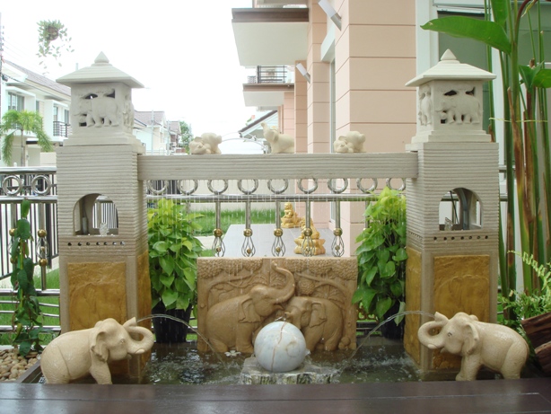 ในสวนเติมน้ำพุหรืออ่างน้ำล้น เพิ่มความสดชื่นและความเคลื่อนไหว ผนังโค้ง เป็นมุมมองที่น่าสนใจ ด้วยสีสันและจังหวะของช่องว่าง ที่ช่วยให้ไม่ทึบตัน วางจังหวะของพื้นทางเดิน และปลูกต้นหนวดปลาดุกแซม รวมไปถึงพื้นสนามหญ้าต่างๆ