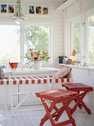 หากเรามีพื้นที่ว่างริมหน้าต่าง ลองหาโต๊ะสีขาวเรียบๆ มาจัดวางคู่กับเก้าอี้สตูลสีแดงเชอร์รี่ เพื่อช่วยสร้างความสดใสในมุมโปรดของคุณ หรือ อาจใช้ม้านั่ง และเปลนอน มาจัดวางคู่กับหมอนอิงลายทาง ก็จะช่วยเปลี่ยนบรรยากาศให้มุมโปรดของคุณดูเก๋ไม่ซ้ำใครได้ค่ะ ถ้าหากที่บ้านเรามีหน้าต่างไม่มากพอ ก็อาจเลือกใช้โคมไฟเก๋ๆ แบบราง (track lighting) หรือ ไฟซ่อน (concealed lighting) มาเปลี่ยนบรรยากาศ เพื่อสร้างอารมณ์อบอุ่นของฤดูร้อนก็ได้เช่นกันค่ะ