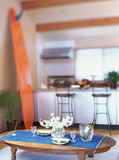 ลองใช้ลวดลาย หรือ ผิวสัมผัสธรรมชาติ อย่าง การทาพื้นไม้สีขาว ใช้พรม Sisal หรือเบาะผ้าลินิน รวมไปถึงการเลือกใช้ของตกแต่งบ้านที่มีกลิ่นอายของท้องทะเลเช่น ปะการัง(ประดิษฐ์) หรือ เปลือกหอย มาช่วยสลัดความจำเจของรูปแบบบ้านในเมืองทั่วๆ ไปให้กลายเป็นบรรยากาศที่เงียบสงบ หรือ อาจผสมผสานการตกแต่งแบบบาหลีจากการหาของตกแต่งโทนมืดอย่าง โต๊ะ และเก้าอี้ไม้สีเข้ม แล้วเพิ่มความเด่นภายในห้องด้วยผ้าม่านบางๆ สีขาว และหมอนอิงลายกราฟฟิคเก๋ๆ ค่ะ