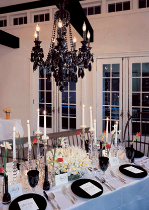 เน้นโทนสีดำในการตกแต่งผสมผสานกับสีขาว อาทิ จาน แก้ว หรือแม้แต่โคมไฟคริสตัลสีดำอันโดดเด่นสง่าอยู่ด้านบน