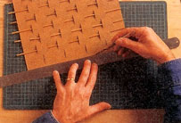 ใช้มีดคมๆกรีดตัดตามรอยเส้นที่ตีไว้ โดยกรีดช่องเว้นช่อง จากนั้นเลื่อนบรรทัดลงมากรีดแบบเดียวกัน