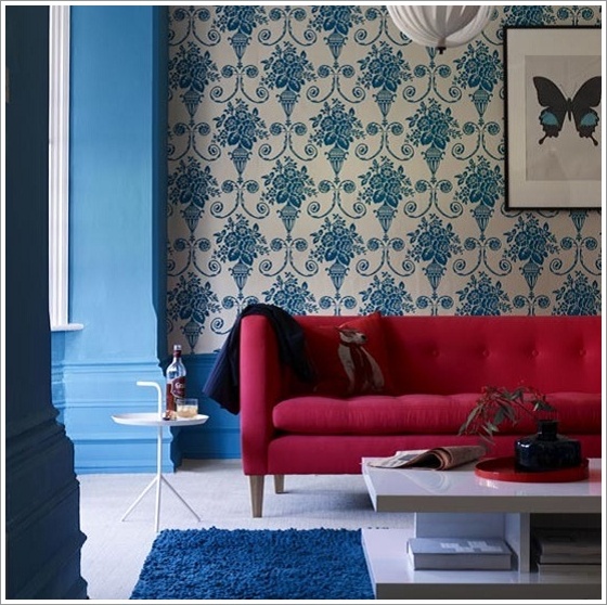 Colourful living room with bold wallpaper