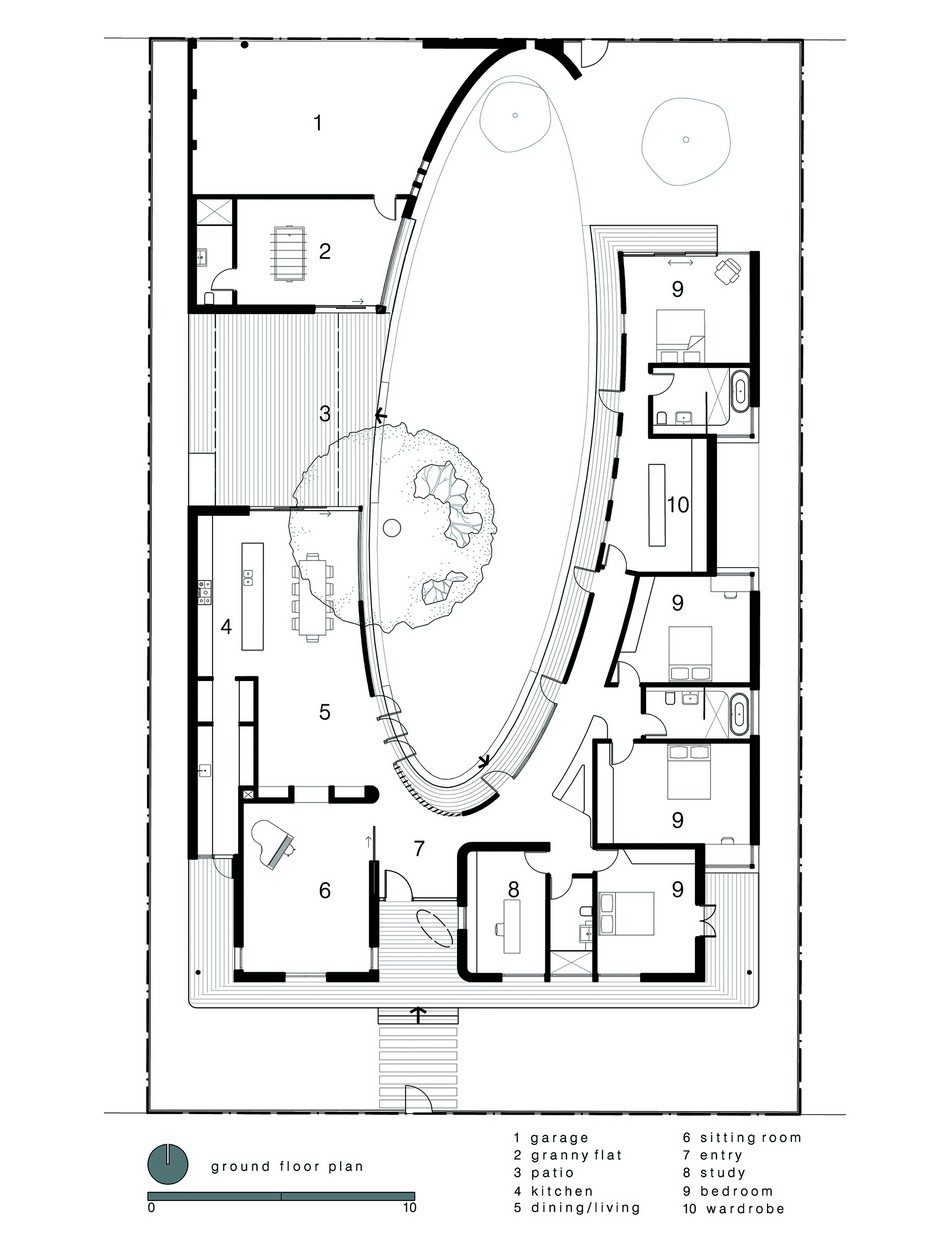แบบบ้านชั้นเดียว กับสนามรูปไข่ วันนี้ Homedecorthai มีไอเดียแบบบ้านชั้นเดียว สุดแนว สำหรับคนชอบการออกแบบดีไซน์ที่ไม่เหมือนใคร ผลงานออกแบบของ  Luigi Rosselli สถาปนิกชาวออสเตรเลีย  โดยออกแบบให้ตัวบ้านล้อมสนามสีเขียวรูปวงรีซึ่งถ้ามองจากมุมสูงจะโดดเด่นมาก มีระเบียงด้านในเชื่อมต่อกันทุกห้องล้อมรอบสนามหญ้าด้านใน