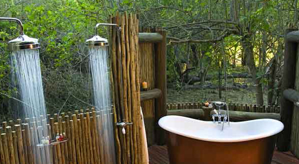 1. กำหนดให้พื้นที่ห้องน้ำเปิดโล่งเชื่อมกับภายนอก ใช้ธรรมชาติเป็นตัวประสาน ด้วยการจัดวางพันธุ์ไม้ต่างๆ บางกรณีผู้ออกแบบ อาจออกแบบให้มีรูปแบบที่พิเศษ เช่น ผนังด้านหนึ่งเป็น กระจกสูงโปร่งยาวตลอดแนวด้านใน ติดตั้งอ่างอาบน้ำ ล้อมรอบด้วยพันธุ์ไม้ จัดวางสุขภัณฑ์ที่เข้าชุดกัน พื้นปูด้วยหินทราย ผนังซีเมนต์ เปลือย หรือจัดเป็นห้องน้ำที่มีหลังคาเปิดโล่ง ผนังบังสายตาก่อน ด้วยแนว ศิลาแลง ไม่สูงมากนัก ด้านในจัดวางสุขภัณฑ์ในตำแหน่ง ที่เหมาะสม เป็นต้น