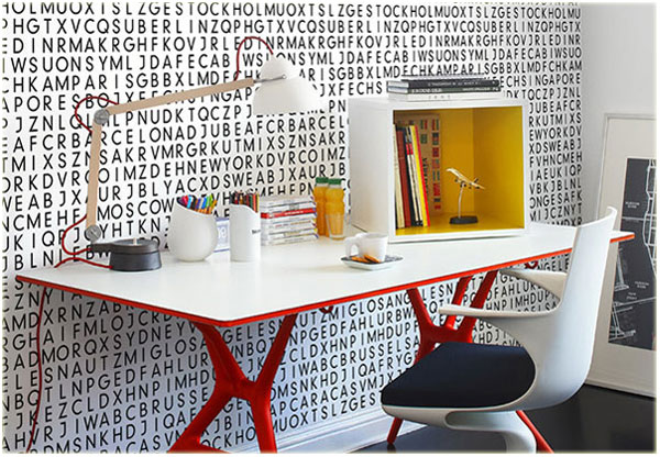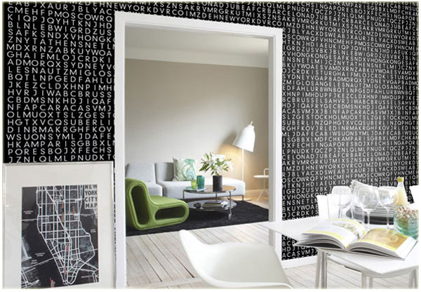 ไอเดียวอลเปเปอร์จากการออกแบบของ Mr.Perswall ถ้าคุณเป็นคนชอบอ่านแล้วอยากแต่งบ้านให้เก๋ด้วยวอลเปเปอร์ลายไม่ซ้ำใคร จะต้องสนใจแน่ๆ กับวอลเปเปอร์ที่เป็นตัวหนังสือภาษาอังกฤษ ตัดสลับขาว-ดำ นี้ ซึ่งนอกจากความชิคของลวดลายแล้ว ถ้าหากว่ามองดีๆ จะพบว่าในตัวหนังสือที่ดูไม่เป็นคำเหล่านี้ซ่อนปริศนาอักษรไว้เป็นชื่อเมืองต่างๆ ทั่วโลก ที่เจอตอนนี้ก็มี STOCKHOLM SINGAPORE LONDON NEWYORK  BERLIN ลองมองหากันดีๆ ใครเจอเมืองอะไรอีกบ้าง …  เอาไว้เวลานั่งชิลๆ จิบกาแฟ ก็ใช้สายตากวาดตาเล่นเกมมองหาปริศนาอักษรบนผนังบ้านตัวเองได้เลย