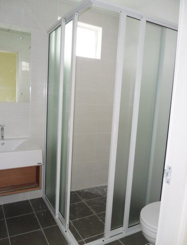 ควรติดตั้งกระเบื้องแบบกันน้ำ หรือ กันลื่นอย่างน้อยในส่วนพื้นที่อาบน้ำ หากบริเวณที่อาบน้ำฝักบัวของคุณมีหน้าต่าง ควรหลีกเลี่ยงการใช้หน้าต่างไม้ สำหรับพื้น คุณอาจเลือกใช้วัสดุหลายๆ ชนิดผสมผสานกัน เช่น ปูกระเบื้องในส่วนเปียก และปูด้วยไม้ในส่วนนอก ที่มักจะแห้งที่สุดก็ได้