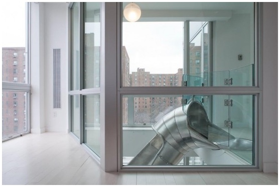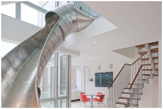 สำหรับใครที่กำลังอยากได้ไอเดียแบบไม่ธรรมดาสำหรับบันไดในบ้าน ลองมาดูไอเดียนี้ก่อนคะ ซึ่งเป็นแบบบันไดบ้านของอพาร์ทเมนต์สองชั้นในนิวยอร์ก ออกแบบโดย Turett Collaborative ที่ว่าไม่ธรรมดานั้น ก็เพราะเป็นบันได้ในรูปแบบสไลเดอร์ทำจากสแตนเลส เป็นบันได้ที่เราสามารถ สามารถสไลด์ลงมาจากชั้นสองได้เลย ไม่ต้องเดินเหมือนบันไดธรรมดาๆ ดูแล้วน่าจะสะดวกและน่าสนุกไม่น้อยเลยนะคะ ถ้าบ้านใครมีเด็กๆรับรองต้องชอบแน่ๆเลยละค้า!