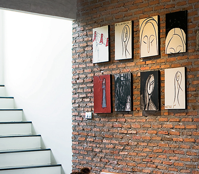 หากชอบงานศิลปะหลากหลายเทคนิค จะนำมาติดในพื้นที่เดียวกันก็ได้ เพียงแต่เลือกชิ้นที่มีสีและขนาดใกล้เคียงกัน สำหรับการนำมาจัดให้เป็นกลุ่มก้อนดูสมดุลก็ควรติดแบบเว้นระยะห่างให้เท่ากัน วิธีนี้อาจไม่ค่อยเหมาะกับผนังเล็กๆ เพราะจะทำให้รู้สึกอึดอัดและรกสายตา แต่หากกะจังหวะได้อย่างลงตัวแล้วละก็ จะสร้างความตื่นตาให้ผนังเกลี้ยงๆที่ไม่มีจุดสนใจได้ดีเชียวละ อย่างเช่นผนังทางขึ้นบันได