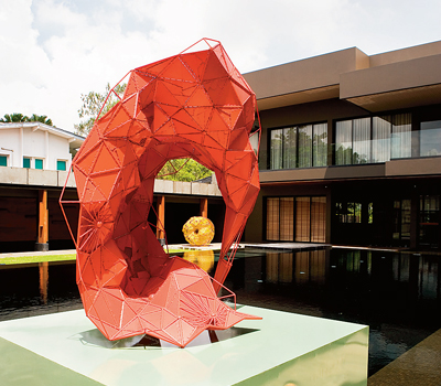 การติดตั้งควรคำนึงถึงพื้นที่โดยรอบและมุมมองในการมองเห็นเป็นสำคัญ งานชิ้นใหญ่ที่ทึบตันอาจทำให้ภายในบ้านดูอึดอัดและเล็กลงไปถนัดตา ลองมองหางานศิลปะที่ชิ้นเล็กลงกว่าที่ตั้งใจไว้สักหน่อย หรือเลือกงานที่มีรูปทรงโปร่งๆแทน โดยจะวางไว้กับพื้นหรือแขวนจากฝ้าเพดานลงมา ก็จะช่วยลดขนาดของพื้นที่ฝ้าสูงๆให้ดูสบายตาขึ้น งานชิ้นใหญ่ๆและทึบตันเหมาะกับการจัดวางไว้ที่ลานนอกบ้าน หรือบ่อน้ำโล่งๆ เพื่อสร้างเรื่องราว ซึ่งบางชิ้นอาจต้องมีการคำนวณฐานรากเพื่อรับน้ำหนักของชิ้นงานด้วย ควรออกแบบจุดส่องไฟ 2 – 4 จุด เพื่อให้ชิ้นงานเป็นจุดนำสายตาของพื้นที่นอกบ้านของเราได้ทั้งตอนกลางวันและกลางคืน