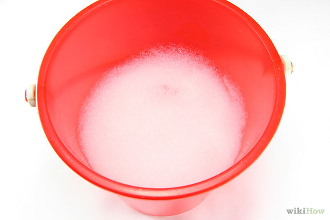 ขั้นตอนที่ 2 ผสมน้ำและสบู่เหลวในถัง หลีกเลี่ยงการใช้ผงซักฟอกเพราะอาจจะทำให้สีวอลเปเปอร์ของคุณจาง และลอกได้
