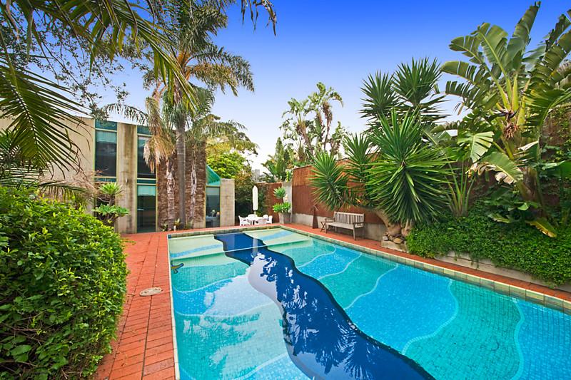 ภายนอกบ้าน มีการปลูกต้นไม้เน้นสีเขียว มีสระว่ายน้ำภายนอก สระเล่นลวดลายสวยงาม กระเบื้องปูรอบสระสีอิฐน้ำตาลแดงตัดกับน้ำในสระที่สีฟ้าสวยงามมากค่ะ
