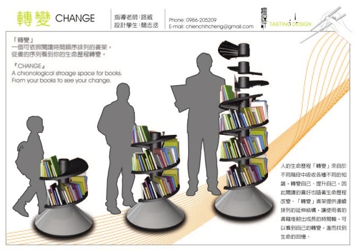 ไอเดียชั้นวางหนังสือ “Change” โดยการออกแบบของ Chih-Cheng ซึ่งเป็นผลงานที่เขาใช้ส่งอาจารย์เพื่อจบการศึกษา โดยตัวชั้นวางหนังสือนี้เขาได้แรงบันดาลใจมาจาก DNA ของคนที่มีลักษณะเป็นเกลียวนั่นเอง นอกจากนี้เรายังสามารถต่อตัวชั้นให้สูงขึ้นไปได้และจะมีที่คั่นหนังสือเพื่อกันหล่นด้วยค่ะ