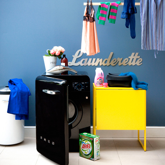 มุมนี้เก๋ขึ้นมากๆด้วยเครื่องซักผ้า ตกแต่งสีผนังด้วยสีฟ้าเข้ม และโดดเด่นกับสีเหลืองของตู้เก็บของ ดูเก๋มาก