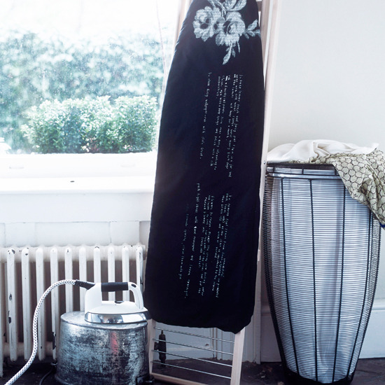 เก๋ไก๋ด้วยผ้ารองรีด และตะกร้าใส่ผ้า โทนสีดำ ตัดกันกับผนังสีขาวๆ ดูแล้วเท่ห์จริงๆ