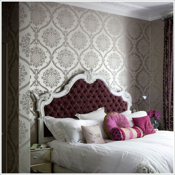 ไอเดียเลือกวอลเปเปอร์ให้ห้องนอนโอ่อ่า หรูหรา โดยการใช้วอลเปเปอร์สีเมทาลิค ลายวินเทจ  แต่อย่าติดทั้งห้องนะคะ เพราะจะไม่เก๋ ไม่ชิคค่ะ เอาแค่มุมใดมุมหนึ่งก็พอค่ะ เช่น มุมหัวนอน เป็นต้น