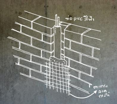 ประมาณ 10 เซนติเมตร (ความหนาปูนฉาบข้างละประมาณ 1.5 เซนติเมตร) แบบนี้จะซ่อนท่อขนาดเล็กได้ ถ้าคิดจะซ่อนบนฝ้าเพดานก็ควรเผื่อระยะจากฝ้าขึ้นไปถึงคานหรือพื้นด้านบนให้เพียงพอ เป็นสายไฟอาจไม่มีปัญหาอะไร แต่ถ้าเป็นท่อน้ำทิ้งจะต้องมีเรื่องของขนาดท่อที่ใหญ่กว่าและความลาดเอียงของท่อด้วย ควรปรึกษาสถาปนิกหรือผู้รู้ก่อนการก่อสร้าง
