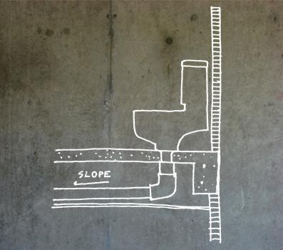 การเดินท่อน้ำทิ้งนั้นต่างจากท่อน้ำดี เพราะต้องการเรื่องของแรงโน้มถ่วงและความลาดเอียดของท่อซึ่งต่างจากท่อน้ำดีที่ใช้แรงดันจากปั๊มน้ำโดยตรง ฉะนั้นควรคิดถึงระยะที่ท่อน้ำทิ้งจะต่อเข้ากับสุขภัณฑ์ต่างๆให้ดีก่อน ว่ามีระยะห่างจากตำแหน่งรวบท่อเพียงใด ยิ่งไกลมากความลาดเอียงก็จะยิ่งมาก ก็แปลว่าต้องใช้พื้นที่ใต้ฝ้าสำหรับซ่อนท่อมาก จนห้องเราอาจมีฝ้าเตี้ยไม่สมส่วน โดยเฉพาะบ้านพักอาศัยนั้นไม่นิยมเจาะคานเพื่อเว้นไว้ให้เดินท่อน้ำทิ้ง แต่จะใช้การเดินลอดใต้คานแทน