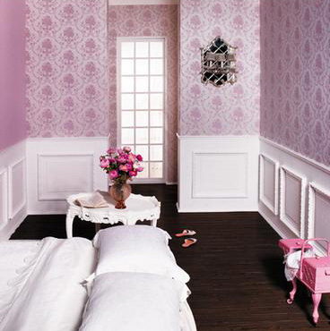 การเลือกใช้วอลล์เปเปอร์ที่มีลายทางจากบนลงล่าง เล่นสีอ่อนๆ และมีทั้งเส้นบางหนา จะทำให้ห้องดูเรียบง่ายแต่มีสไตล์ ควรเลือกเฟอร์นิเจอน์ลายดอกไม้แบบหรูหรา อย่างโซฟาผ้าลายกุหลาบสีม่วงอมชมพู แล้วเสริมความสดใสขึ้นอีกนิดด้วยผ้าคลุมสีสดๆ จะช่วยให้ห้องนั่งเล่นดึงดูดสมาชิกภายในบ้านให้มารวมมาตัวกันหลบร้อนอยู่ที่ห้องนี้